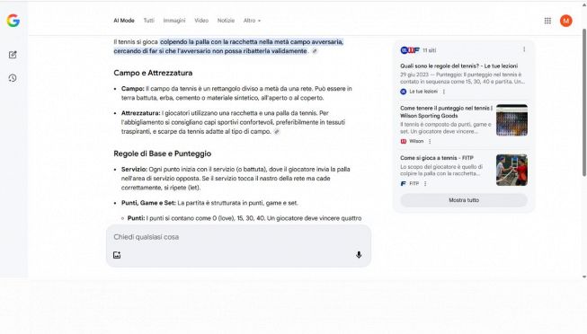 A questo punto comparirà una nuova interfaccia: sulla destra è possibile vedere le fonti utilizzate dall’intelligenza artificiale per rispondere alla domanda, mentre nella parte bassa si trova un box di conversazione per continuare il dialogo con Gemini e chiedere ulteriori dettagli.